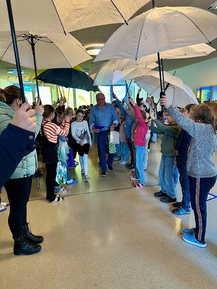So klang die Feier mit einem Lachen, viel Applaus und einem Spalier aus Regenschirmen, gebildet von Elternbeirat und Kindern, aus. Ein würdiger, fröhlicher und zugleich emotionaler Abschied. Herr Messert war sichtlich berührt und freute sich sehr über die gelungene Feier.