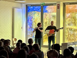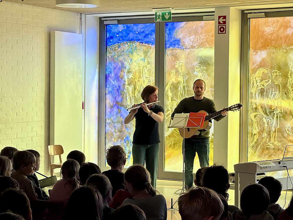 Mit viel Begeisterung und Fachwissen präsentierten die beiden vor allem das Klavier, die Gitarre sowie verschiedene Querflöten. Dabei erklärten sie anschaulich, wie die Instrumente funktionieren, wie sie klingen und was sie so besonders macht. Die Kinder hörten aufmerksam zu und konnten viele spannende Eindrücke sammeln.